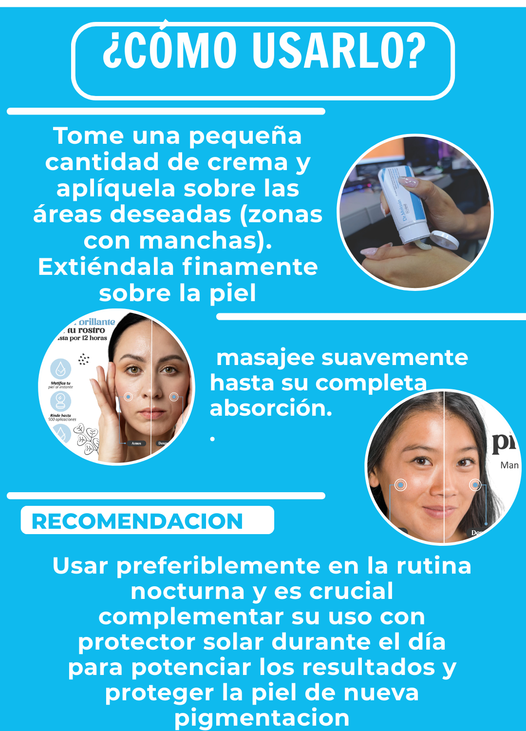 .Me encanta este producto! Llevo como una semana usándolo y ya noto un cambio he notado mi piel mas luminosa y con textura mas tersa y sin manchas . Se siente muy suave en la piel
